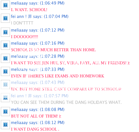 OH GOSH, IT'S BEEN A LONG TIME SINCE AMELIA AND I HAD THIS ARGUEMENT. From her point of view, it's like school is much more fun than home cause she can see all her friends. From my point of view, you gotta wake up early and read boring books. I mean, you can see your friends during holidays right? Well, yeah not all of them. But when you go to school you see bitches and bastards too right?